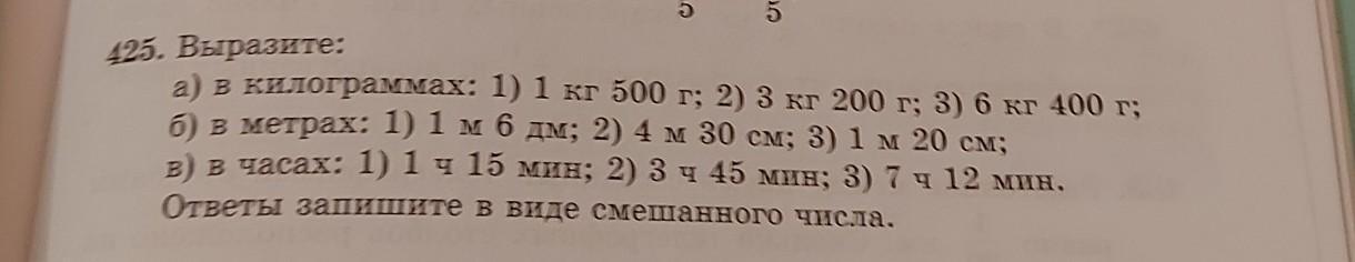 425. Выразите: а) в килограммах: 1) 1 кг 500 г; 2) 3 кг 200 г; 3) 6 кг 400 г; б) в метрах: 1) 1 м 6 дм; 2) 4 м 30 см; 3) 1 м 20 см; в) в часах: 1) 1 ч 15 мин; 2) 3 ч 45 мин; 3) 7 ч 12 мин. Ответы запишите в виде смешанного числа.