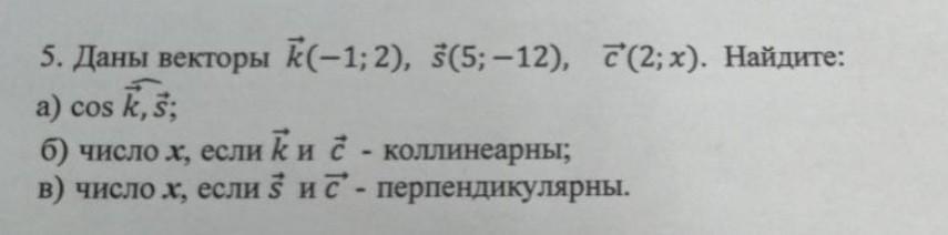 Даны векторы k(-1;2), s(5;-12), c(2;x). Найдите: a)cos(∠k, s) ; b) число x, если k и c - коллинеарные; c) число x, если s и c - перпендикулярны.