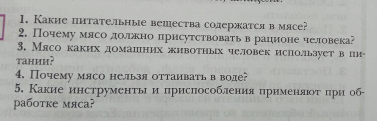 1 витамины С и А они укрепляют мышцы и кости тела 2 Это необходимо потому что в неем белка очень много что даёт нам энергию для продолжения жизни 3 Корова , свинья , баран . 4 потому что она наполнится водой и будет не такая сочная . 5 или жарят через огонь или через пар или в кипеченой воде. Правильно 100% я так писал на отлично написал.