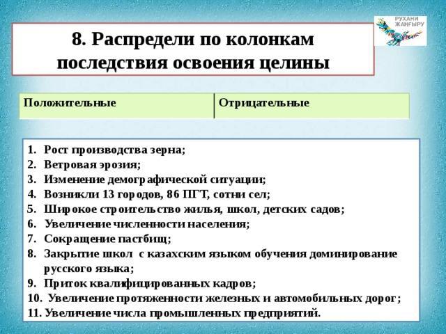 6. Сделайте сравнительный анализ положительных и отрицательных последствий освоения целинных и залежных земель на сельское хозяйство Казахстана. Целина "+" и "-"
