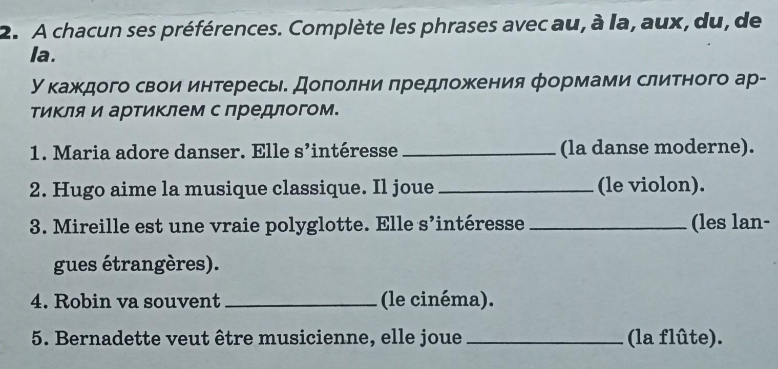 A chacun ses préférences. Complète les phrases avec: au, à la, aux, du, de la. 1. Maria adore danser. Elle s'intéresse …(la danse moderne)