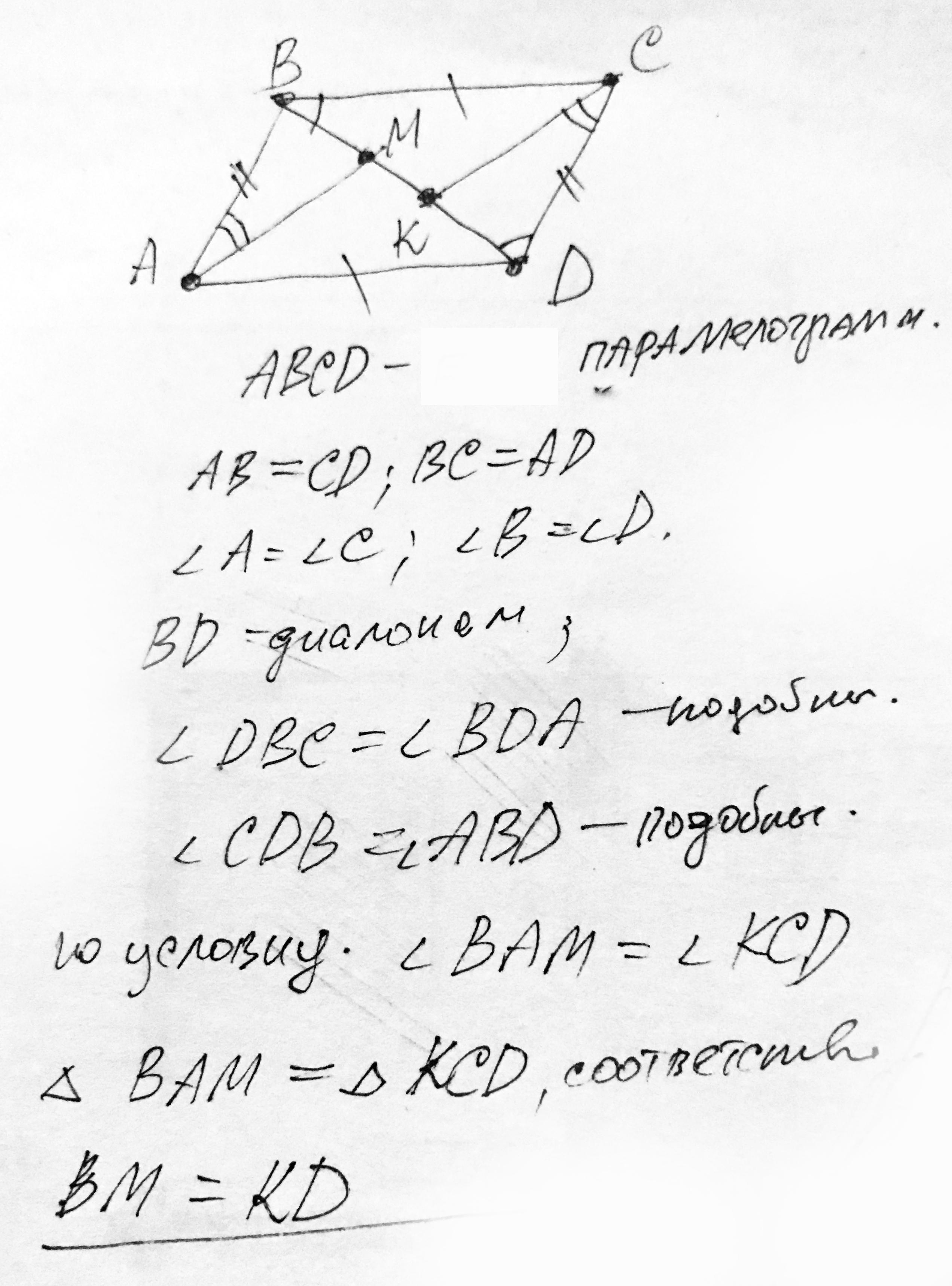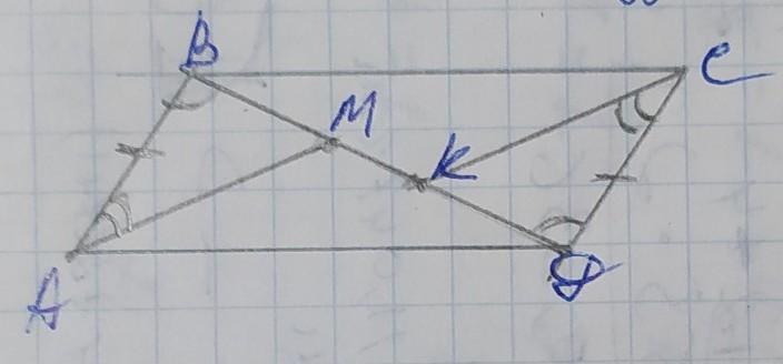 На диагонали BD параллелограмма ABCD отметили точки M и K так, что ∠BAM = ∠DCK (точка M лежит между точками B и K). Докажите, что BM = DK. Обязательно ДАНО, ДОКАЗАТЬ и ЧЕРТЕЖ или ответ признаю не полным.