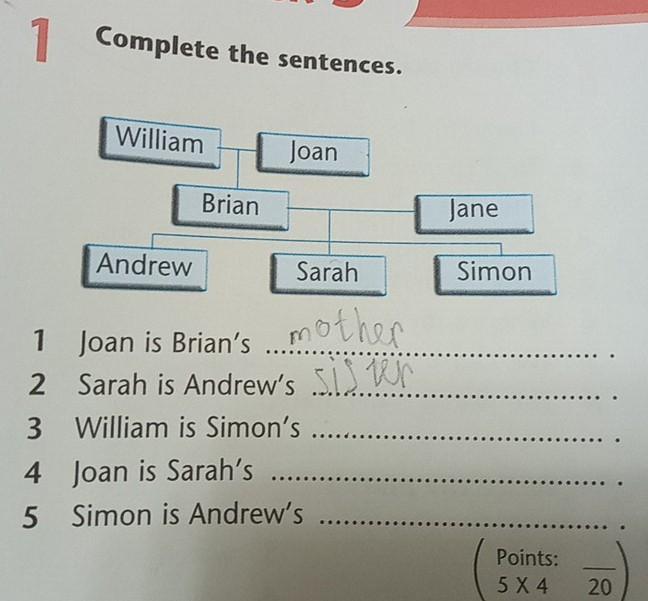 1 Complete the sentences. William Joan Brian Jane Andrew Sarah Simon 1 Joan is Brian's mother 2 Sarah is Andrew's Sisw 3 William is Simon's 4 Joan is Sarah's ....... 5 Simon is Andrew's ...