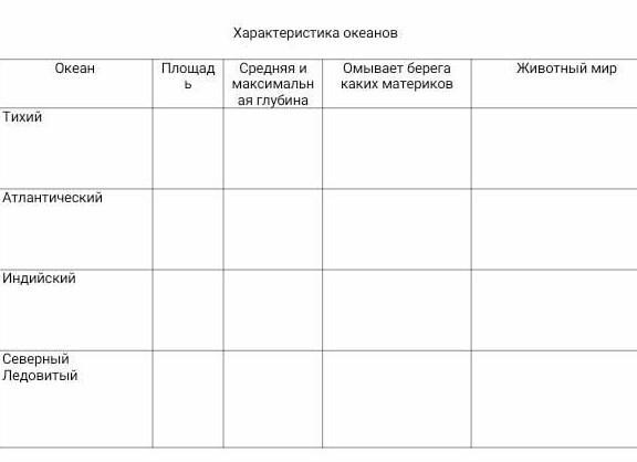 океана Площадь, мнл. км2 Объем, мнл. км3 Средняя глубина, м Макс. глубина, м Процент от Мирового океана Особенности