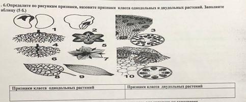 Определите по рисункам признаки, назовите признаки класса одннодольных и двудольных растений. заполните таблицу:
