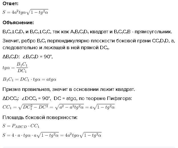 Діагональ правильної чотирикутної призми дорівнює d i утворює кут а з бічним ребром. Знайдіть площу бічної поверхні призми.