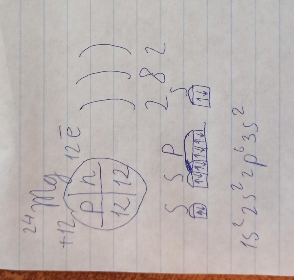 Наклонное число (над надписью слева) равняться относительной атомной массе, то есть, 24. Заряд ядра, количество електронов и протонов – порядковый номер, то есть, 12. Что бы узнать количество нейтронов, от нуклонногго числа отнимаем количество протонов. 24-12=12. В первом электронном уровне максимальное количество електронов – 2, количество на последнем равно номеру группе, в которой находится елемент, то есть, два. 12-(2+2)=8 – это количество електронов в среднем электронном уровне. Дальше заполняем "коморки", и пишем формулу.