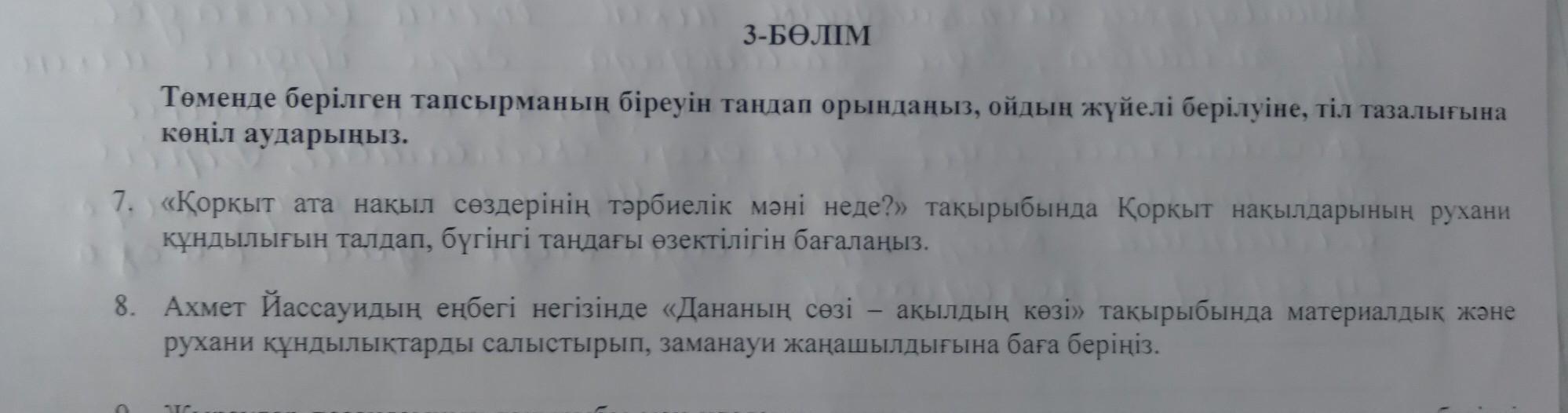 8. Ахмет Йассауидын енбегi негiзiнде «Дананын сөзi - акылдын көзі>> такырыбында материалдык жане рухани кундылыктарды салыстырып, заманауи жанашылдыгына баға берiнiз.