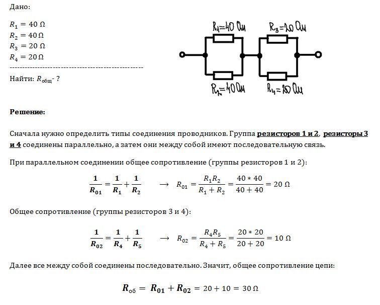 опредилите общее сопротивление цепи R1=40ом R2=40ом R3=20ом R4=20ом(известно что ответ 30, напишите решение)
