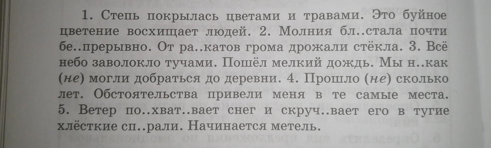 Ответ ( большими буквами будут обозначены шрамматические основы): 1. СТЕПЬ ПОКРЫЛАСЬ цветами и травами, и это буйное ЦВЕТЕНИЕ ВОСХИЩАЕТ людей. (после запятой - союз И). 2. МОЛНИЯ БЛЕСТЕЛА почти беспоерывно, и от раскатов грома ДРОЖАЛИ СТЁКЛА. (после запятой - союз И). 3. Всё НЕБО ЗАВОЛОКЛО тучами, и ПОШЁЛ мелкий ДОЖДЬ, а МЫ никак не МОГЛИ ДОБРАТЬСЯ до деревни. (после первой запятой - союз И, после второй запятой - А). 4. ПРОШЛО НЕСКОЛЬКО ЛЕТ, и ОБСТОЯТЕЛЬСТВА ПРИВЕЛИ меня в те самые места. ( после запятой - союз И). 5. ВЕТЕР ПОДХВАТЫВАЕТ снег и СКРУЧИВАЕТ его в тугие, хлёстские спирали, и НАЧИНАЕТСЯ МЕТЕЛЬ (после запятой - союз И).