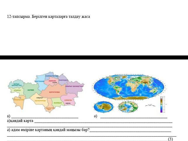 а) 1.қазақстанның облыстары мен олардың орталықтары бейнеленген карта, 2.жер шары мен ондағы объектілердің биіктігі және тереңдігі бейнеленген