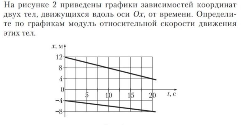 На рисунке 2 приведены графики зависимостей координат двух тел, движущихся вдоль оси Ох от времени. Определите по графику модуль относительной скоростей этих тел.