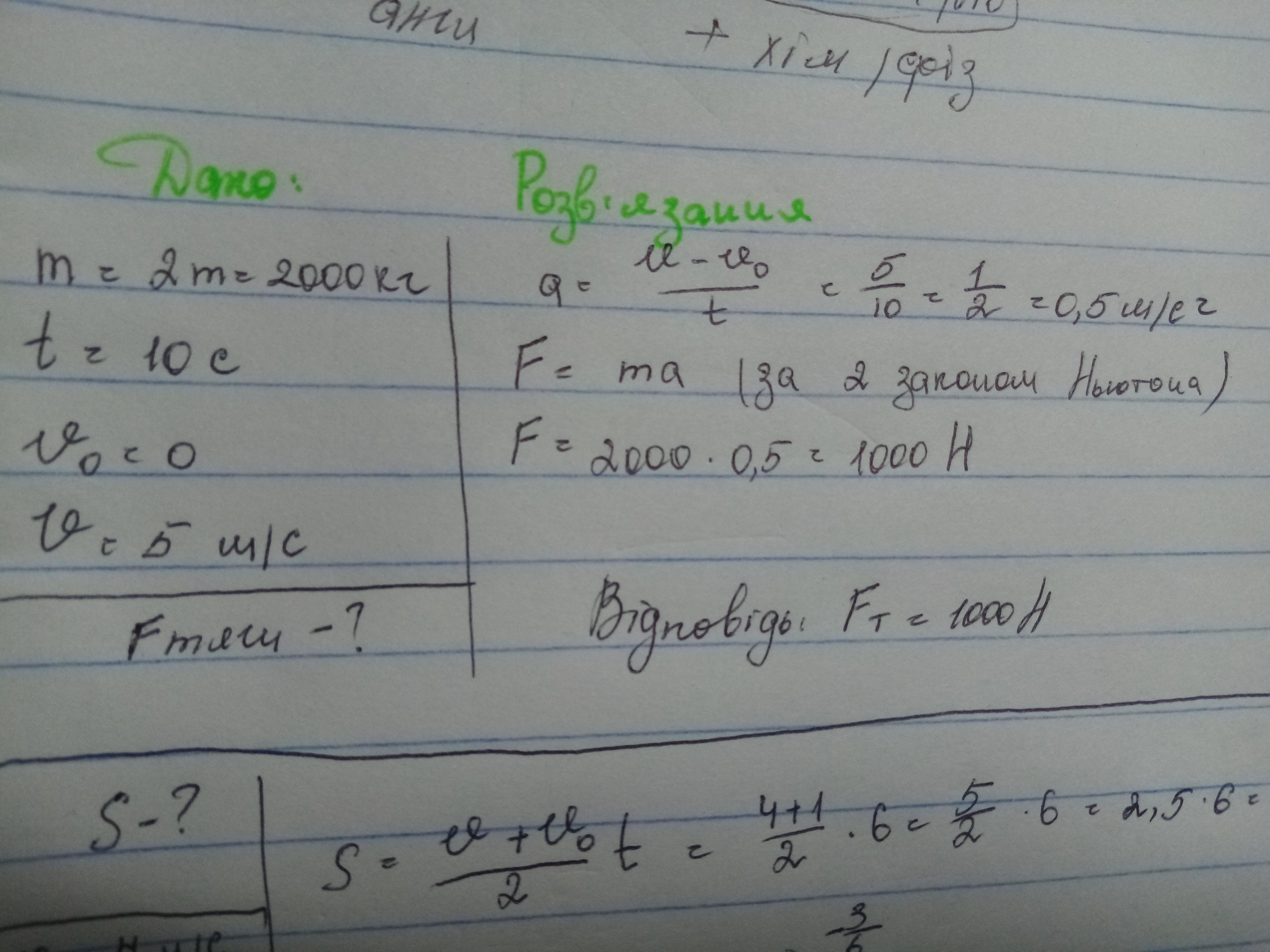Автобус з масою 2 т за 10 с від початку руху досяг швидкості 5м/с. Визначити силу тяги двигуна автобуса вважаючи рух рівносмінним і нехтуючи тертям.