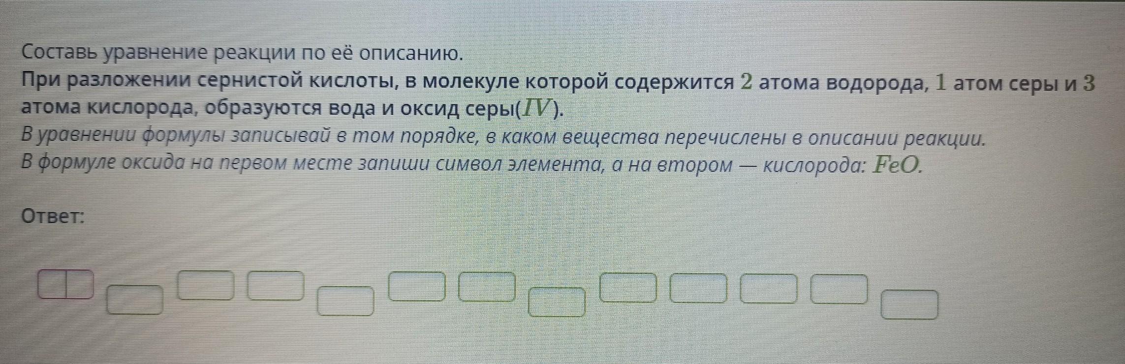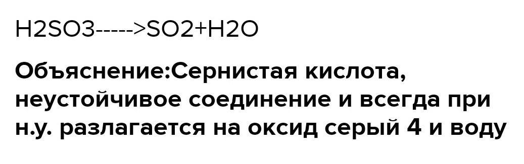 Составь уравнение реакции по её описанию. При разложении сернистой кислоты, в молекуле которой содержится 2 атома водорода, 1 атом серы и 3 атома кислорода, образуются вода и оксид серы(IV).