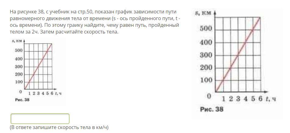 На рисунке 38, с учебник на стр.50, показан график зависимости пути равномерного движения тела от времени (s - ось пройденного пути, t - ось времени). По этому граику найдите, чему равен путь, пройденный телом за 2ч. Затем расчитайте скорость тела.