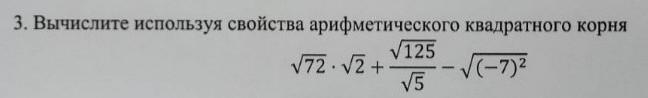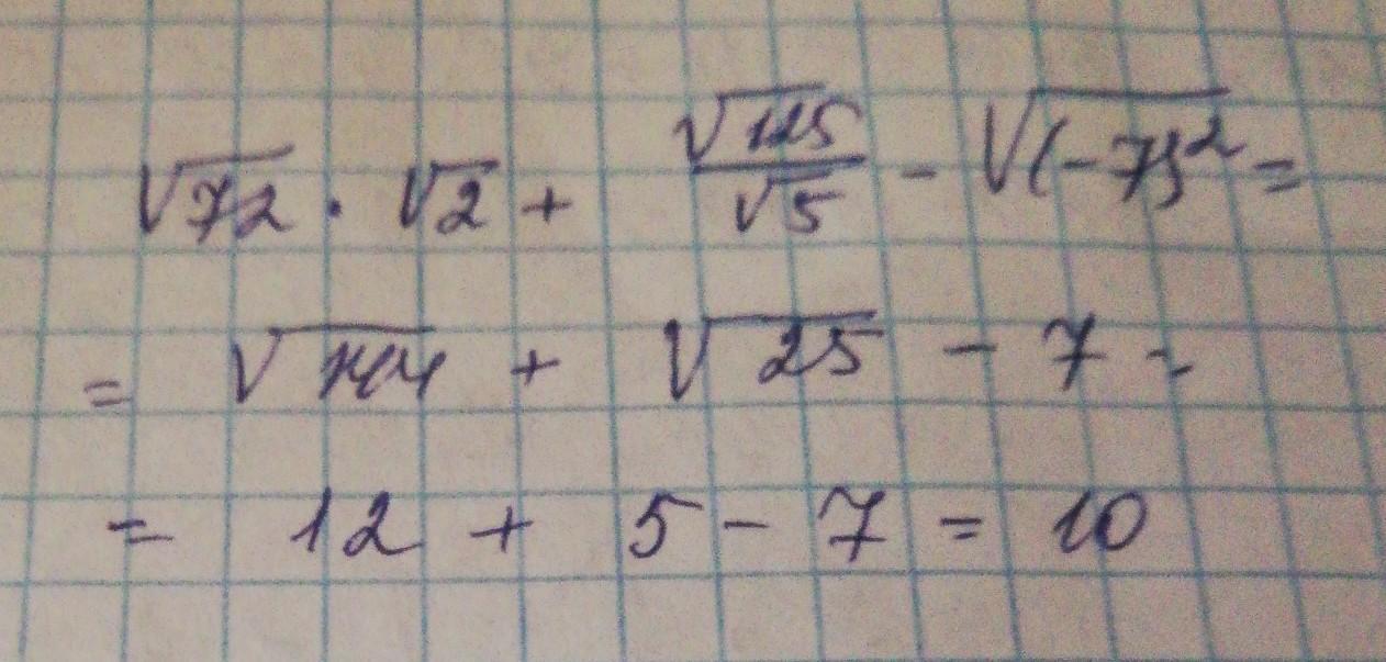 ответ 10. по свойству корней перемножим 72 на 2, это 144, корень 12. далее поделим 125 на 5, это 25, корень 5. -7 в квадрате это 49, корень 7