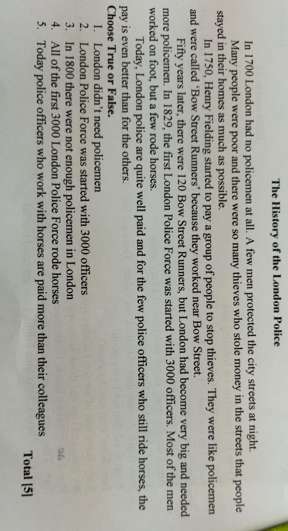 Reading Task. Read the article about London police. The History of the London Police In 1700 London had no policemen at all. A few men protected the city streets at night. Many people were poor and there were so many thieves who stole money in the streets that people stayed in their homes as much as possible. In 1750, Henry Fielding started to pay a group of people to stop thieves. They were like policemen and were called 'Bow Street Runners because they worked near Bow Street. Fifty years later, there were 120 Bow Street Runners, but London had become very big and needed more policemen. In 1829, the first London Police Force was started with 3000 officers. Most of the men worked on foot, but a few rode horses. Today, London police are quite well paid and for the few police officers who still ride horses, the pay is even better than for the others. Choose True or False. 1. London didn't need policemen 2. London Police Force was started with 3000 officers 3. In 1800 there were not enough policemen in London 4. All of the first 3000 London Police Force rode horses 5. Today police officers who work with horses are paid more than their colleagues Total [5]