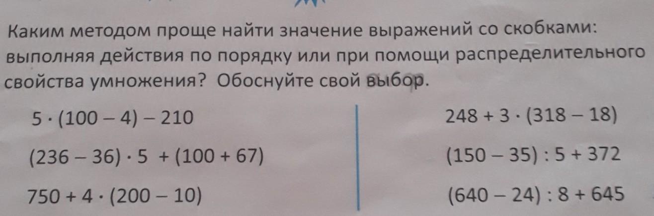 Каким методом проще найти значение выражения со скобками выполнять действия по порядку или при помощи распределительного свойства умножения Обоснуйте свой выбор