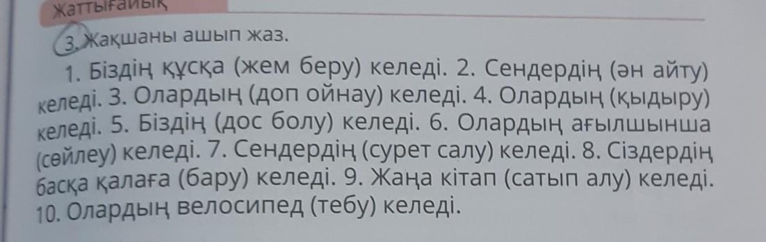 1 жем беруге 2 ән айткандарына 3 доп ойнаганына 4 кыдырууына 5 дос болуымыз ға 6 сөйлеу не 7 сурет салуына 8 баруына 9 сатып алуға 10 тебуине