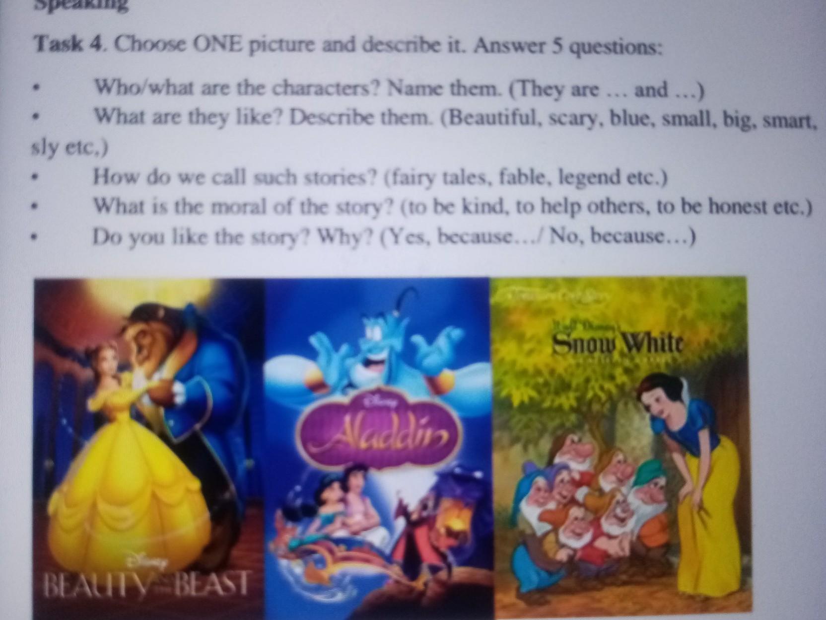 Speaking Task 4. Choose ONE picture and describe it. Answer 5 questions: Who/what are the characters? Name them. (They are ... and ...) What are they like? Describe them. (Beautiful, scary, blue, small, big, smart, sly etc.) How do we call such stories? (fairy tales, fable, legend etc.) What is the moral of the story? (to be kind, to help others, to be honest etc.) Do you like the story? Why? (Yes, because../ No, because...) தாபாத்தது հան Ֆեդրակ Snow White Aladdin Damer BEAUTY BEAST [5]