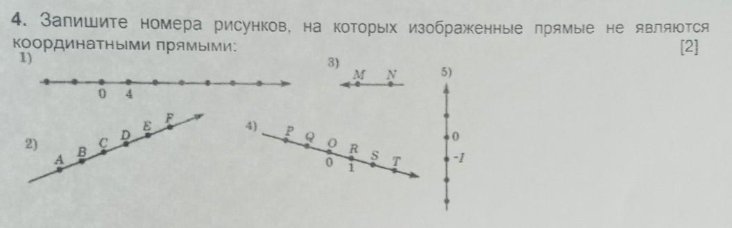 4. Запишите номера рисунков, на которых изображенные прямые не являются координатными прямыми: [2] 8) M N 5) 04 4 P QOR SI 2) 0 ".