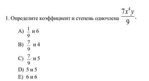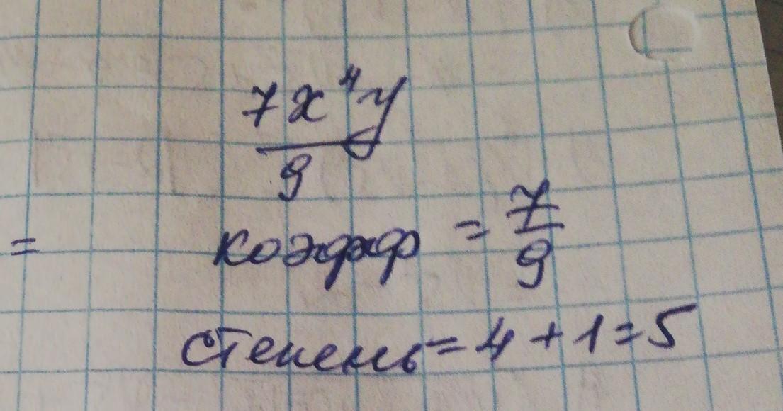 Объяснение:k(коэффициент) это цифры то есть 7:9(просто дробью) а степень x равен 4 а y равен 1 плюсуем получаем 5