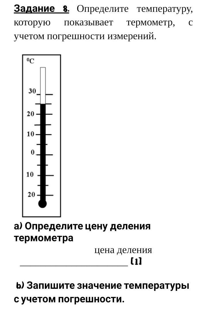 Определите температуру, которую показывает термометр, с учетом погрешности измерений.