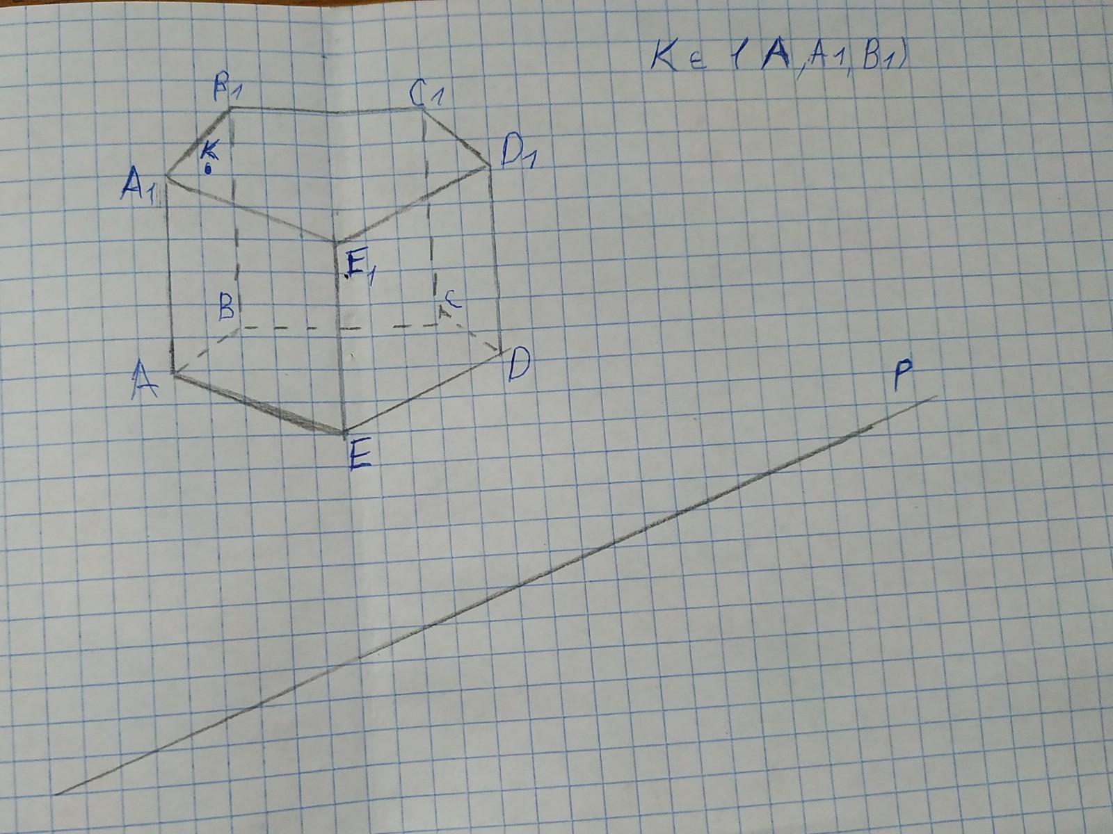 Находим точку пересечения прямых P и AE. Через это точку и точку F проводим прямую, которая пересекает сторону EE1 в точке G. Отрезок FG будет второй стороной сечения.