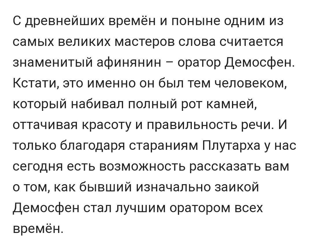 У Демосфена были проблемы с артикуляций и произношением. Чтобы «развязать язык», он тренировался говорить, набив камешками рот. Эта техника, которая теперь называется «камешки Демосфена», до сих пор используется некоторыми логопедами для улучшения дикции. Вот как это работает.