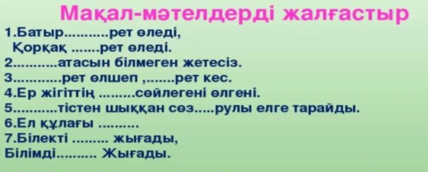 1.Батыр… Мақал-мәтелдерді жалғастыр …рет өледі, Қорқақ …рет өледі. 2… …атасын білмеген жетесіз. … 3… …рет өлшеп ,… , …рет кес. 4.Ер жігіттің … …сөйлегені өлгені. 5… …тістен шыққан сөз…рулы елге тарайды. 6.Ел құлағы … 7.Білекті … … жығады, … Білімді… … Жығады. …