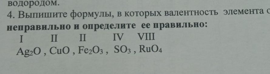 4. Выпишите формулы, в которых валентность элемента определена неправильно и определите ее правильно: І II II IV VIII Ag20, CuO, Fe2O3, SO3 , RuO4