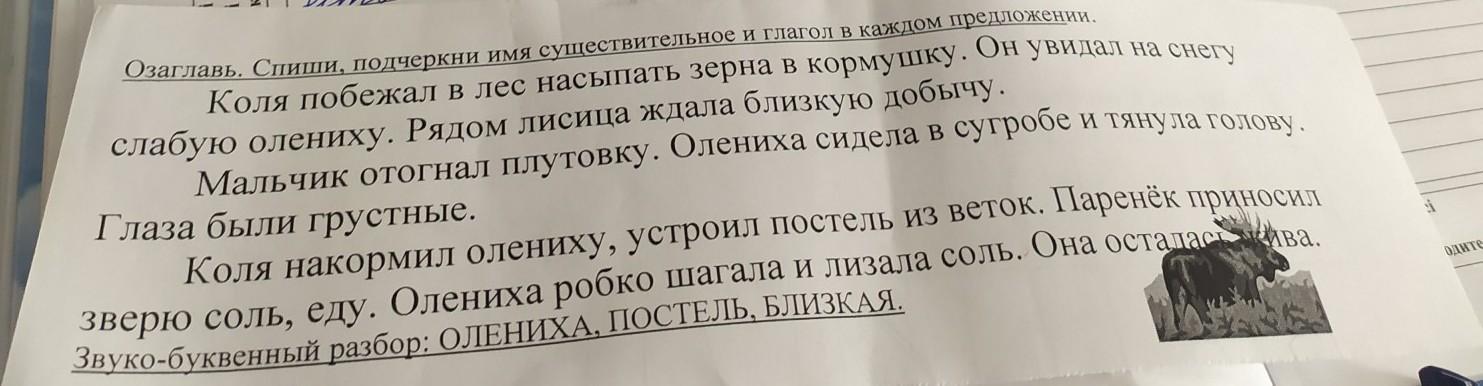 Помогите ПЛИЗ СКОРЕЕ!!!Озаглавь. Спиши, подчеркни имя существительное и глагол в каждом предложении. Коля побежал в лес насыпать зерна в кормушку. Он увидал на снегу слабую олениху. Рядом лисица ждала близкую добычу. Мальчик отогнал плутовку. Олениха сидела в сугробе и тянула голову. Глаза были грустные. Коля накормил олениху, устроил постель из веток. Паренёк приноси зверю соль, еду. Олениха робко шагала и лизала соль. Она осталась жива. Звуко-буквенный разбор: ОЛЕНИХА, ПОСТЕЛЬ, БЛИЗКАЯ.