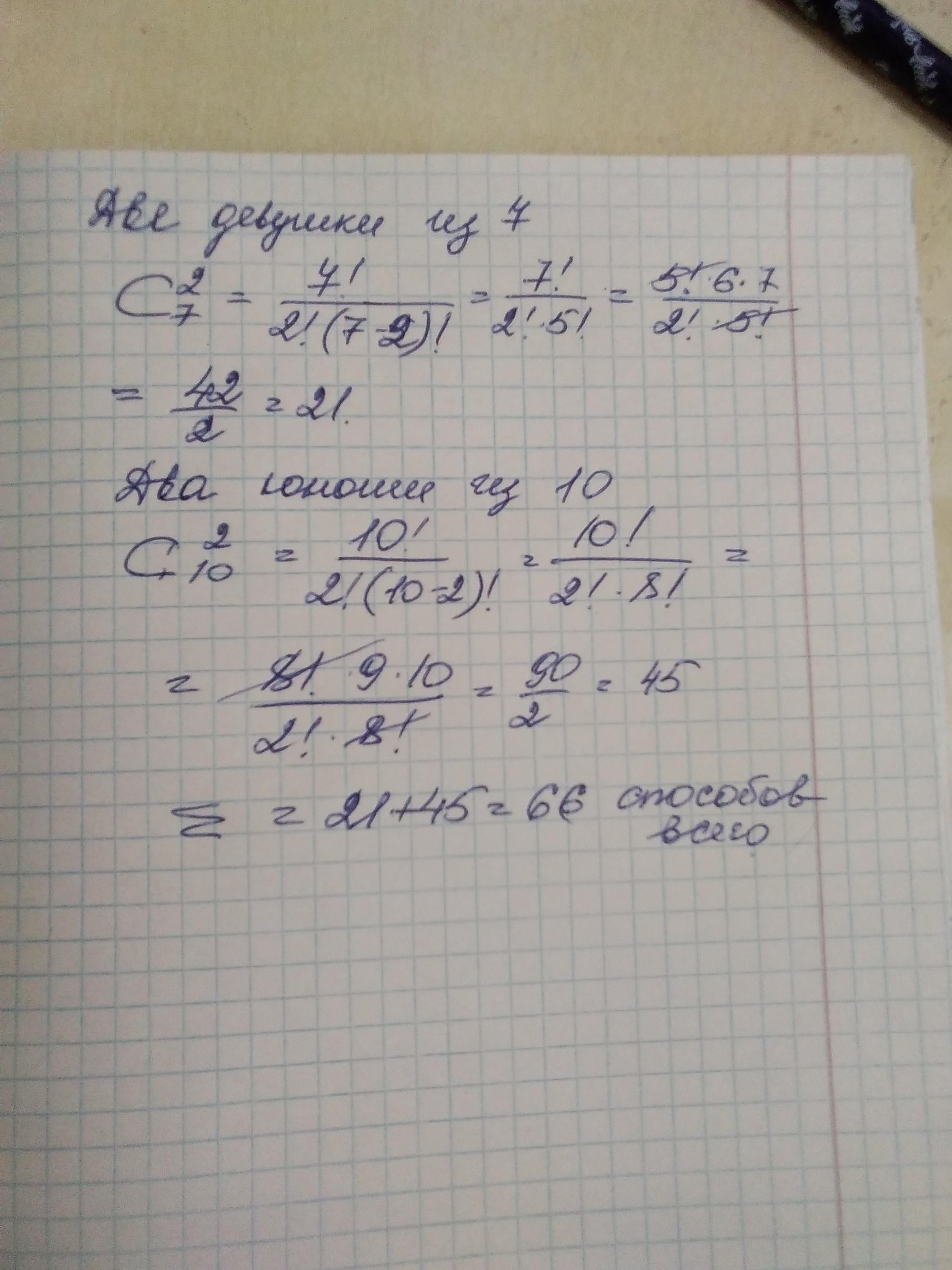 Студенческая группа состоит из 17 человек, среди которых 10 юношей и 7 девушек. Сколькими способами можно выбрать двух человек одного пола чтобы они потрахались?
