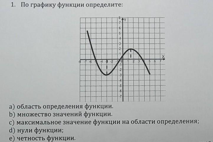 1. По графику функции определите: а) область определения функции. b) множество значений функции. с) максимальное значение функции на области определения; d) нули функции; е) четность функции.