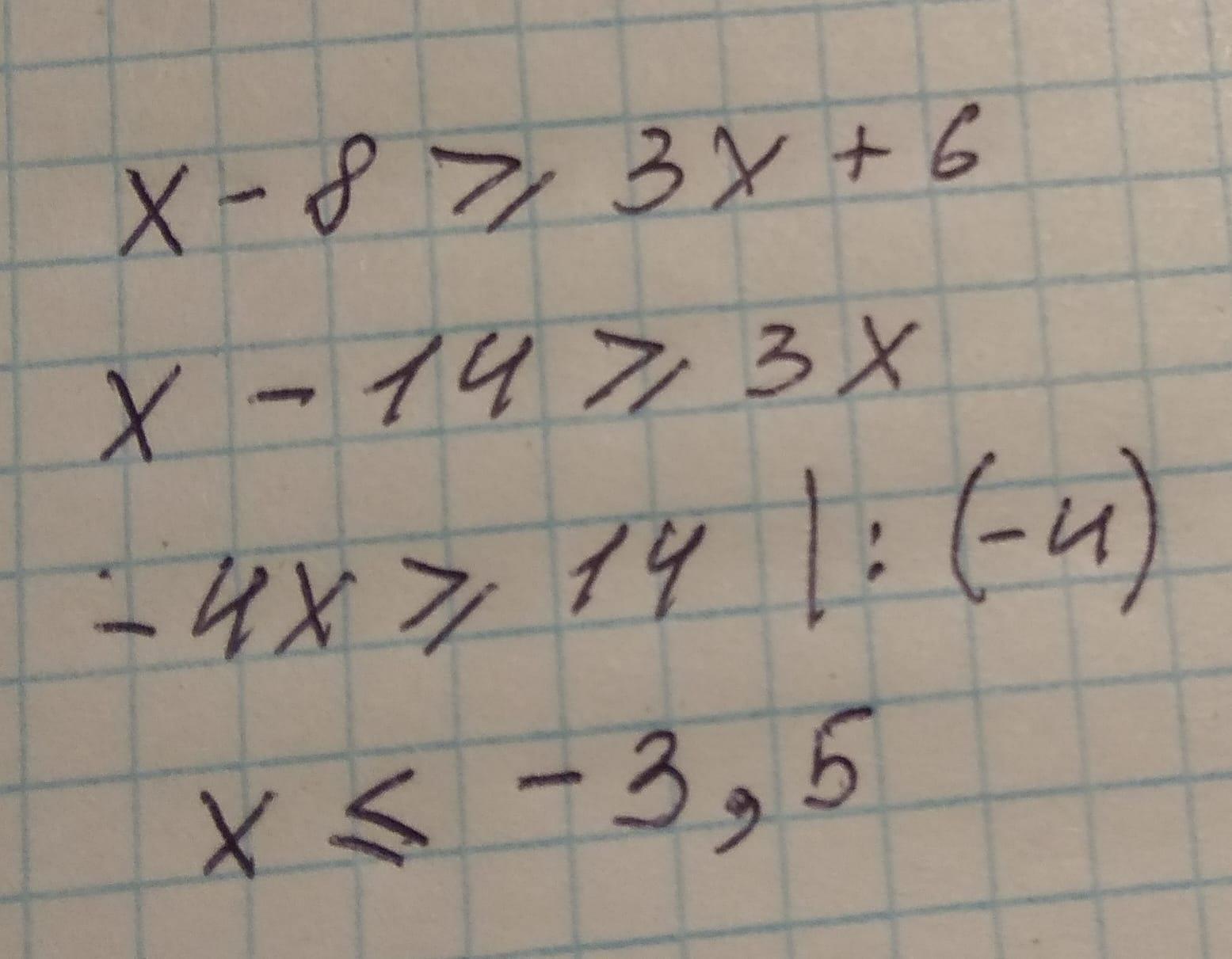 решите линейное неравенство: х-8 больше или равно 3х+6
