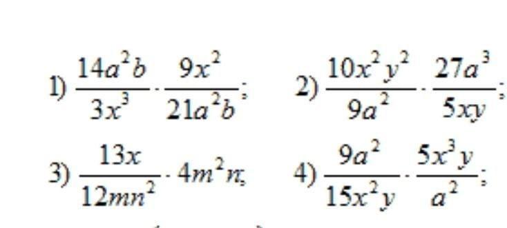 1) \ \dfrac{14a^{2} b}{3x^{3} } \cdot\dfrac{9x^{2} }{21a^{2} b} =\dfrac{2\cdot7\cdot a^{2} b\cdot3\cdot3\cdot x^{2} }{3\cdot x^{2} \cdot x\cdot3\cdot 7\cdot a^{2} b}=\boxed{\dfrac{2}{x} } \\\\\\2) \ \dfrac{10x^{2} y^{2} }{9a^{2} } \cdot\dfrac{27a^{3} }{5xy} =\dfrac{2\cdot5\cdot x\cdot x\cdot y \cdot y\cdot3\cdot9\cdot a^{2} \cdot a}{9\cdot a^{2}\cdot5\cdot x\cdot y } =\boxed{6axy}