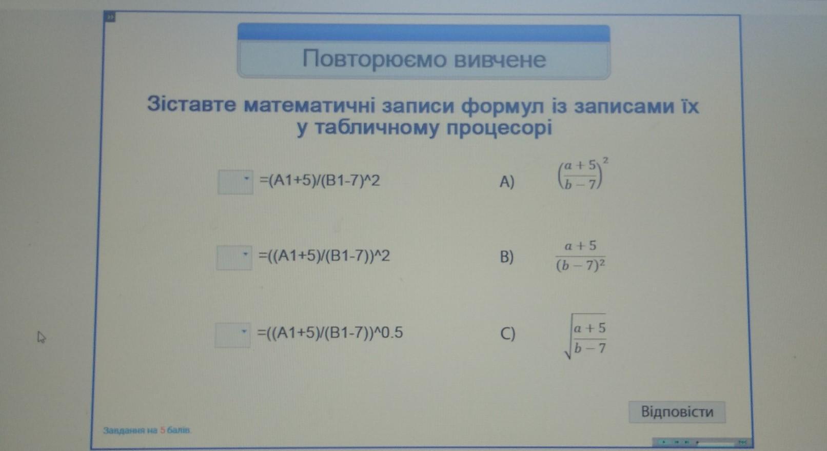 Зіставте математичні записи формул із записами їх у табличнмоу процесорі.