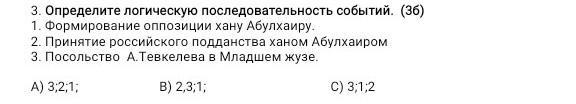 Определите логическую последовательность событий. (3б) 1. Формирование оппозиции хану Абулхаиру. 2. Принятие российского подданства ханом Абулхаиром 3. Посольство А.Тевкелева в Младшем жузе. A) 3;2;1; B) 2,3;1; С) 3;1;2