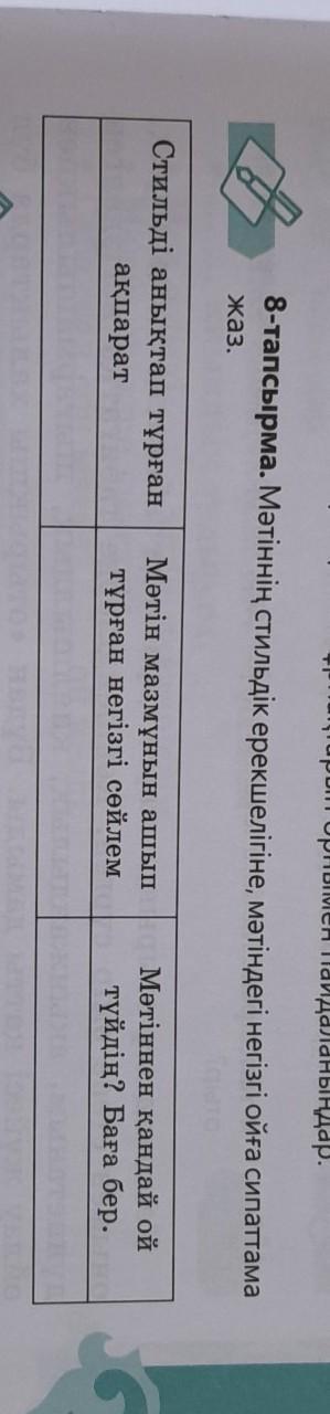 8-тапсырма. Мәтiннiн стильдік ерекшелiгiне, мәтiндегi негiзгi ойға сипаттама жаз. Стильдi аныктап турган акпарат Мәтін мазмұнын ашып тұрған негiзгi сөйлем Мәтiннен кандай ой туйдiн? Баға бер.