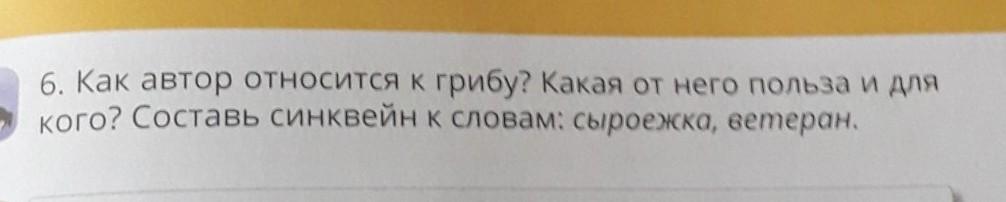 Синквейн к слову "сыроежка": Гриб Летний, осенний Растет, радует, кормит Нет разнообразнее и красивей Сыроежки Синквейн к слову "ветеран": Солдат Храбрый, мужественный Воевал, спасал, рисковал Благодаря ему на земле мир Уважение