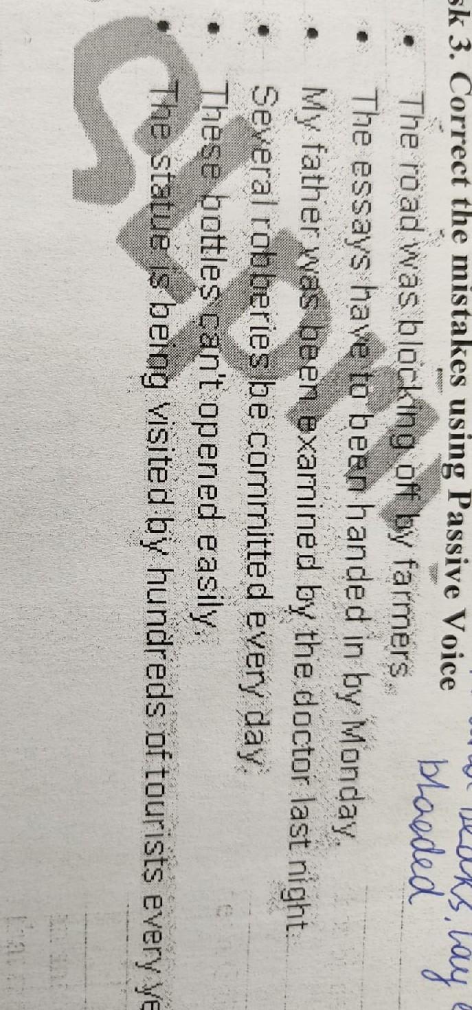 Task 3. Correct the mistakes using Passive The road was blocking off by farmers. The essays have to been handed in by Monday. My father was been examined by the doctor last night: Several robberies be committed every day. These bottles çan't opened easily. The statue is being visited by hundreds of tourists every ye