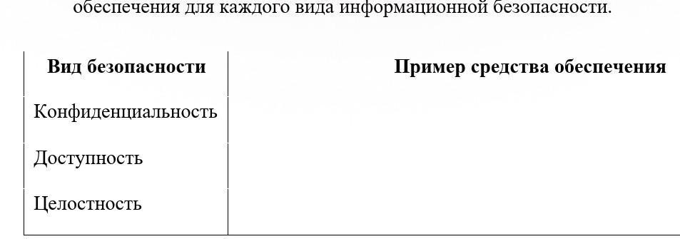 6. Для обеспечения информационной безопасности могут применяться различные средства. Заполните таблицу, указав примеры средств обеспечения для каждого вида информационной безопасности.