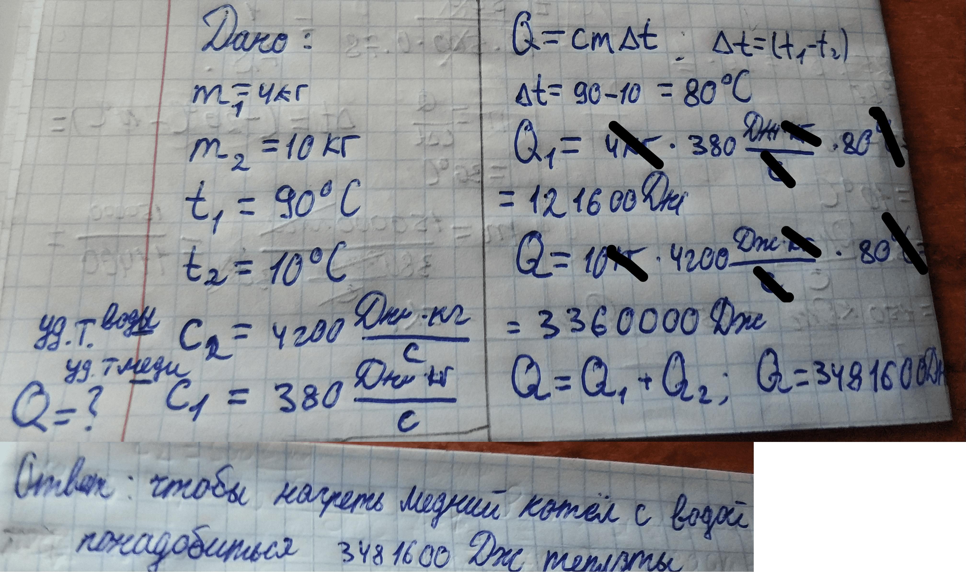 задача №1 В медный котёл массой 4 кг налита вода массой 10 кг. Какое количество теплоты нужно передать котлу с водой для изменения их температуры от 10 до 90 °С?