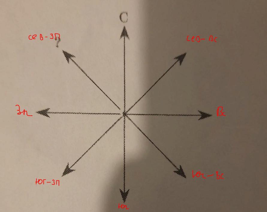 Давай как вернемся к рисунку. Навпротив Севера, будет конечно Юг. Позначаем. Следовательно налево от севера - запад, вправо - восток. Позначаем. Но ещё между сторонами есть 4 стрелочки. Мы их пишем. Вот что получилось. Вывод: вариант: В
