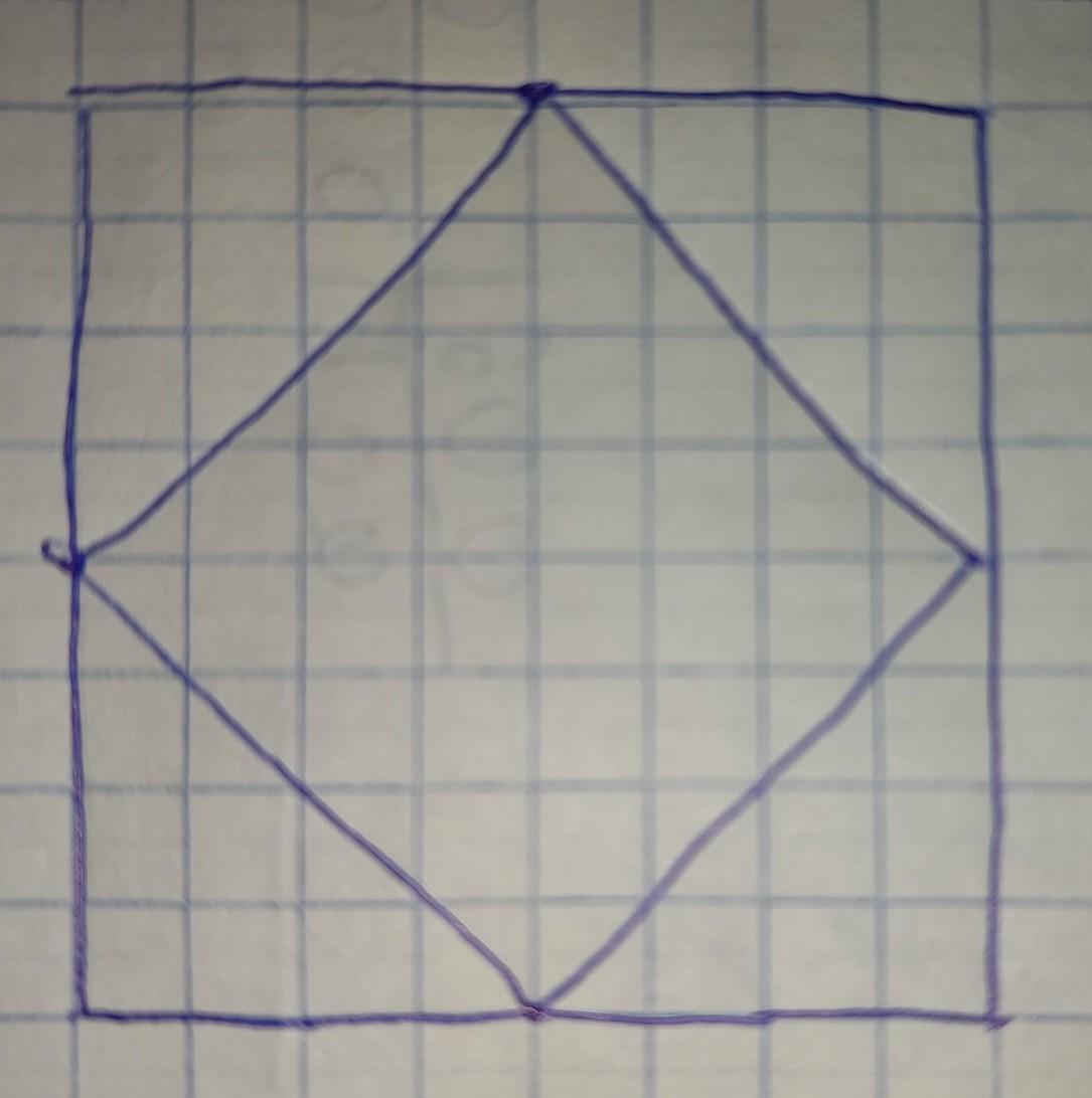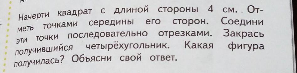 Начерти квадрат с длиной стороны 4 см. Отметь точками сторон. Соедини последовательно отрезками. Закрась получившийся четырёхугольник. четырёхугольник. Какая фигура получилась? Объясни свой ответ.