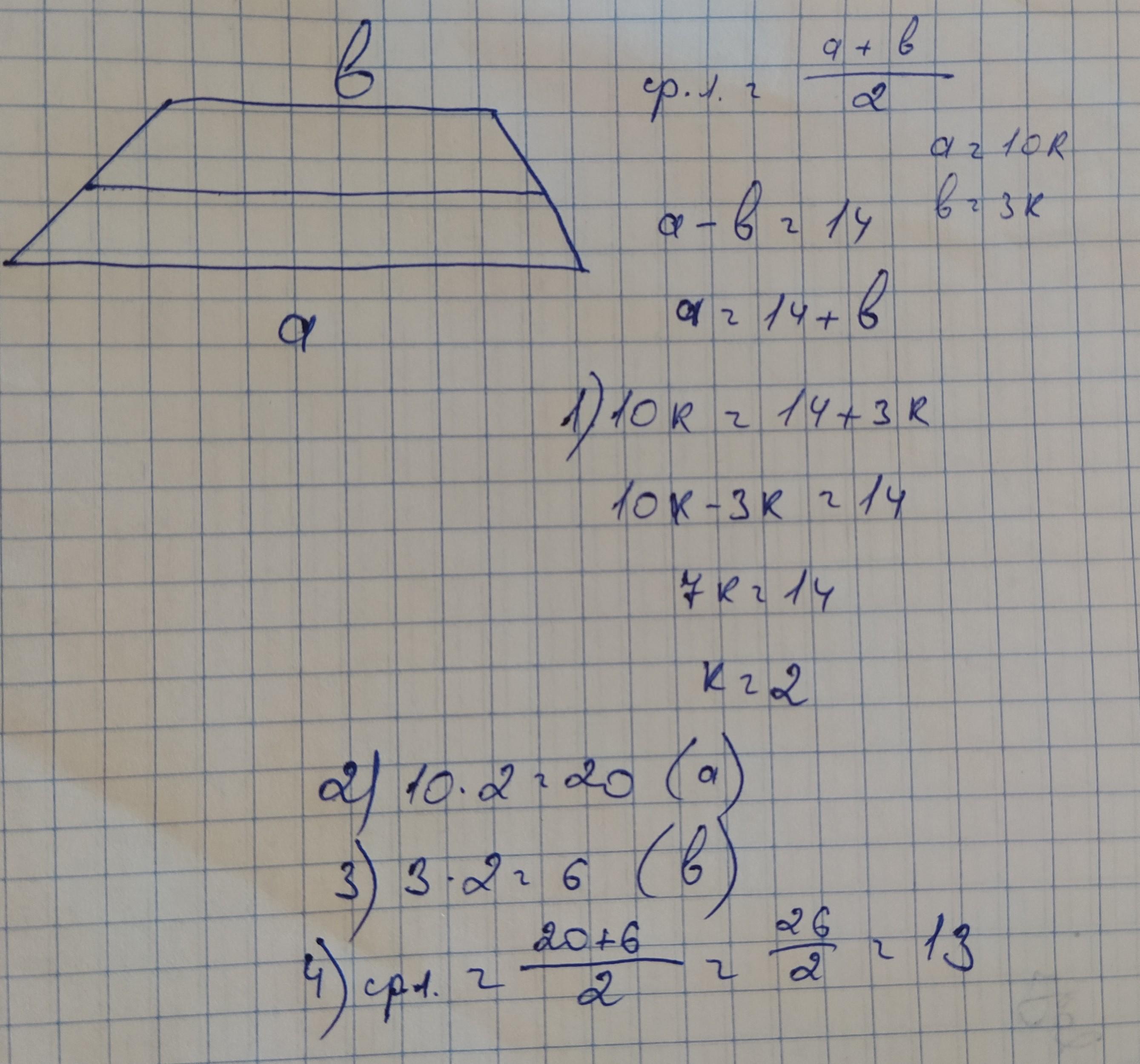 Разность оснований трапеции равна 14 дм. Найдите длинну средней линии трапеции, если основания её относятся как 10:3