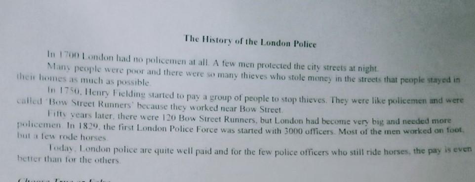 Choose True or False. 1. Many people protected the city street 2. All people were poor 3. Many people haven't enough money 4. Henry Fielding didn't pay money to people to stop thieves 5. Bow Street Runners were named after the street