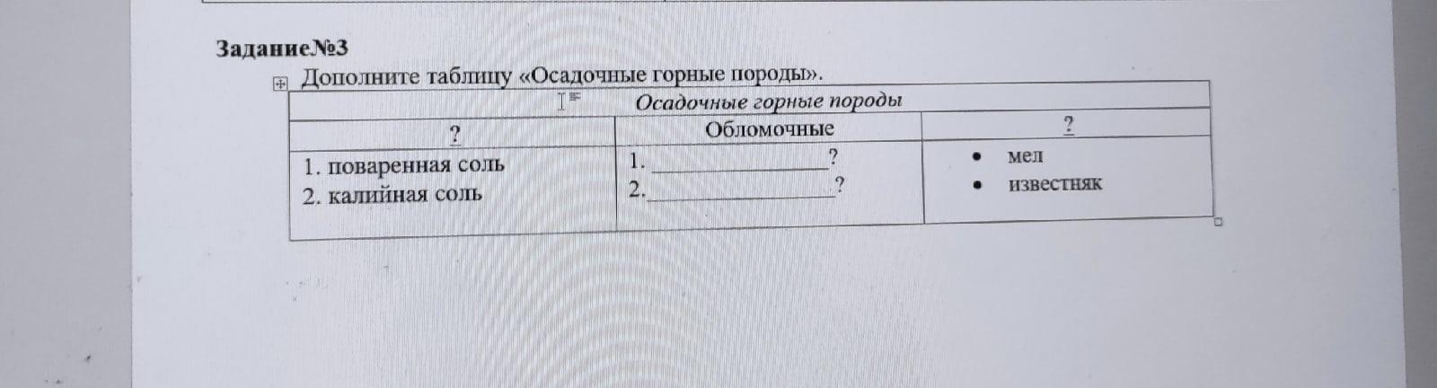 Дополните таблицу «Осадочные горные породы».