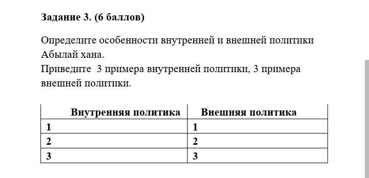 Внешняя : ждал возможности возвращения исконных казахский земель. 2 опирался на народных батыров. 3 обеспечение неприкосновенности государства. Внутрянная : власть хана безгранична 2 присвоил право приговаривать преступников к смертной казни 3 с помощью батыров создал боеспособную армию.