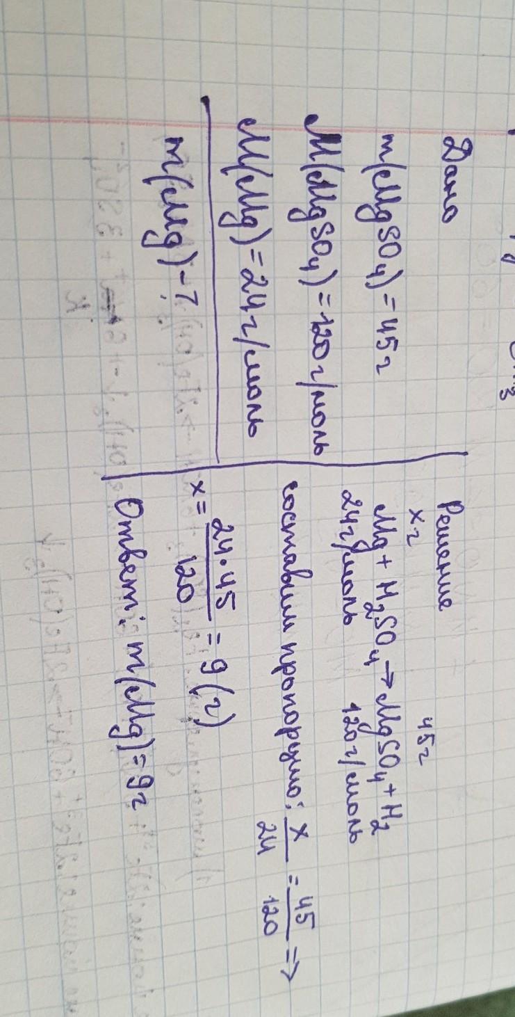 в результате реакции серной кислоты с магнием образовалось 45г сульфата магния чему ровна маса Магния